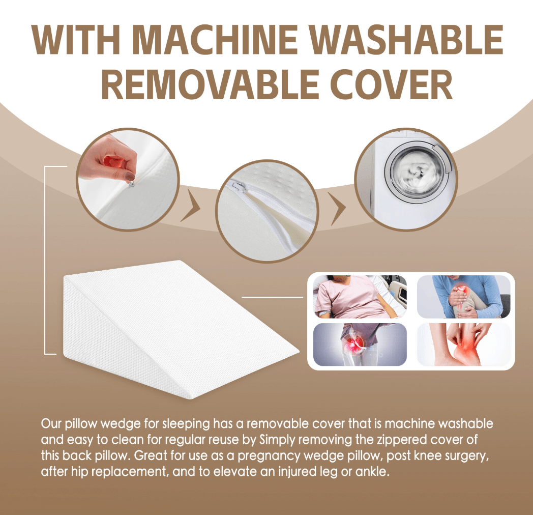 For enhanced relief, sleep with two foam wedge pillows—one supporting your back and the other your legs. This helps ease pressure and strain, letting you sleep peacefully while reducing aches and pains.
